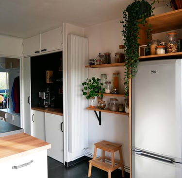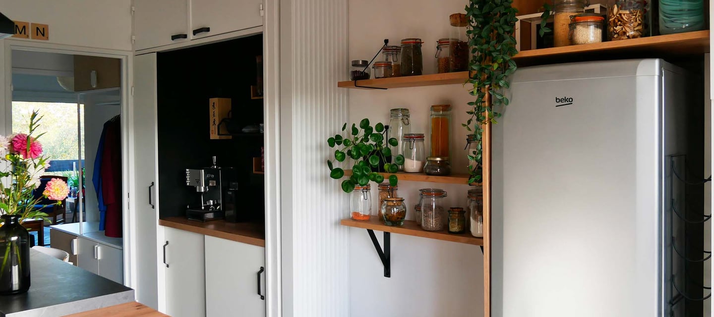 Pour cette rénovation d'un appartement des années 70, qui avait déjà connu quelques mises à jour dans les années 90, l'objectif principal était de créer des ambiances familiales et colorées, de ramener un peu de chaleur et d'authenticité au logement, le tout dans un budget raisonnable avec participation des propriétaires aux travaux.